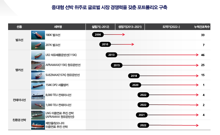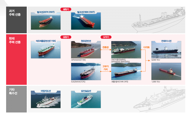 핵심 사업은 아프라막스, 수에즈막스급 유조선과 셔틀탱커, 중대형 컨테이너선 건조입니다.